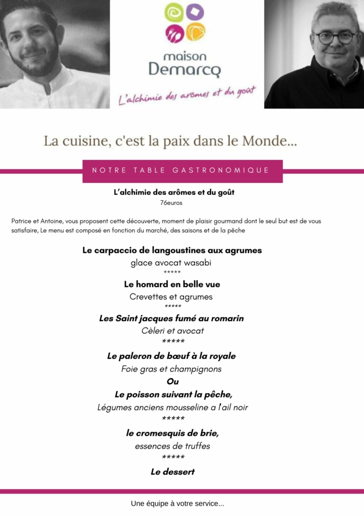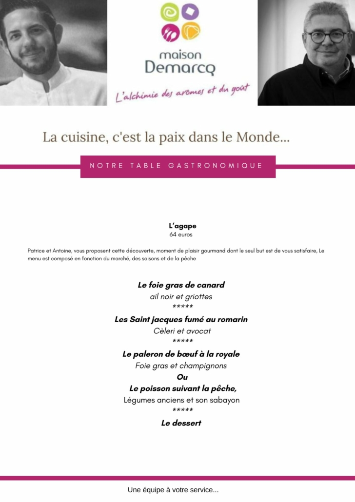 L’ensemble de nos plats, dont la présentation est toujours raffinée, sont élaborés avec des Produits de Qualité et de Saison. Une sommelière professionnelle propose aux clients une Carte des Vins Diversifiée et Originale, en cohérence avec le style de cuisine réalisé par les 2 chefs. La Maison Demarcq s’engage à vous réservez une Prestation Sur-Mesure, Adaptée à Vos Souhaits.